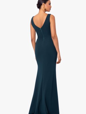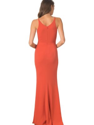Women’s Long Sleeveless Boat Neck Ruffle Side Slit Scuba Crepe Gown