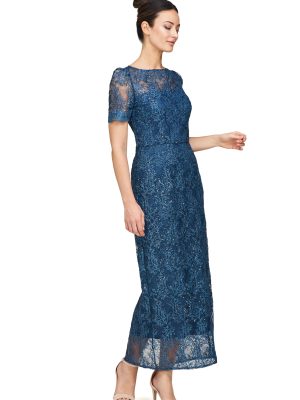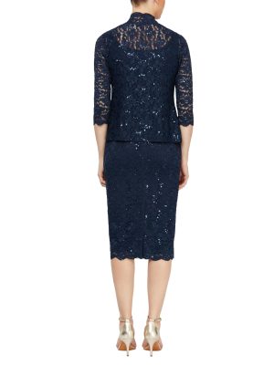 Women’s Tea Length Sequin Lace Special Occasion Dress with Illusion Sleeve Jacket (Petite and Regular Sizes)
