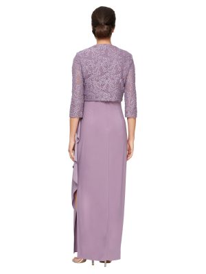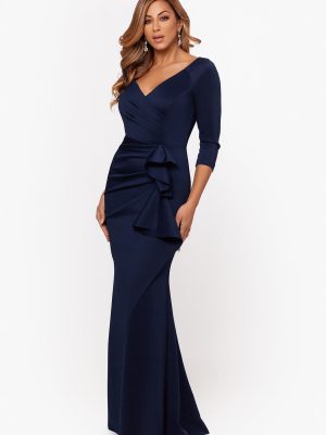 Women’s Slimming Long Length ¾ Sleeve Mother of The Bride Dress with Cascade Ruffle Skirt and Side Ruching