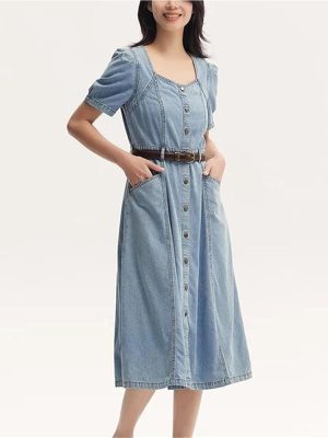Women’s Square Neck Long Denim Dress Summer Vintage Waist Strap Half Sleeve Trendy Jean Dresses