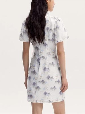 Women’s Floral Embroidery Print Cheongsam Dress Summer Bubble Sleeves Buttoned Traditional Chinese Dresses