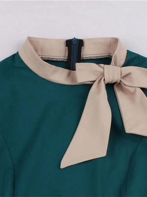 Women’s Pleated Cotton Midi Dress Vintage High Waist Bow Tie Neck Pocket Swing Sundress Party Dresses