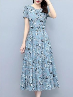 Women’s Boho Chiffon Floral Summer Beach Dress Short Sleeve Bodycon Long Party Dress