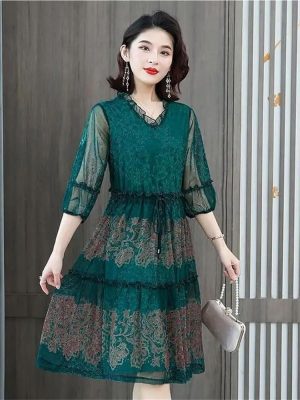 Lapel Three-Quarter Sleeve Knee Length Pleated Floral Women’s Sheath Dress
