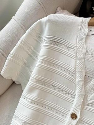 Women’s French Knitted Slim A-Line Dress V Neck Short Sleeve Button Hollow Out Sweater Summer Dresses